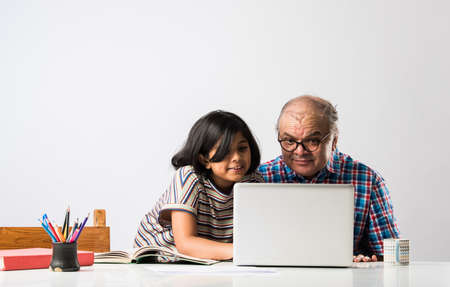 Indian grandfather teaching granddaughter with books, pencil and laptop, home schooling or tuition