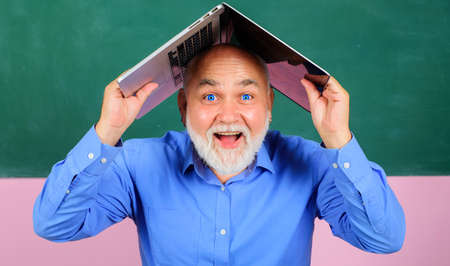 Happy bearded man with laptop over head. Smiling teacher with notebook in classroom.