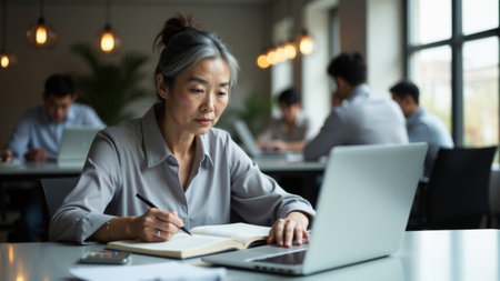 Asian businesswoman working with laptop computer and writing in notebook at office