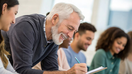 A cheerful retiree sporting a neatly trimmed beard is engaged in a group job orientation. He leans forward his wrinkled hands gripping a pen poised over a notepad. Around him a.