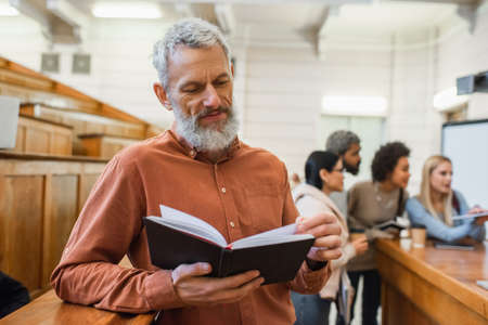 Middle aged teacher holding notebook near blurred multiethnic students in university