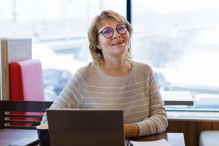 Woman in cafe and office working with laptop