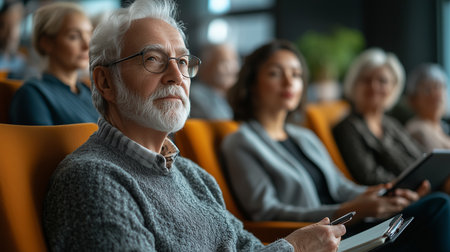 a senior man with glasses is listening intently at a seminar, focused on the presentation in a lecture hall