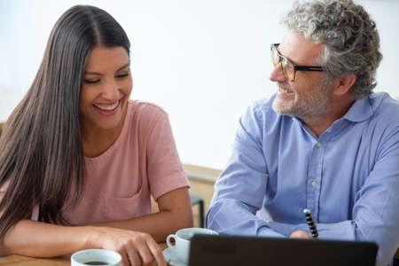 Happy joyful mature man and young woman sitting at open laptop, looking at display, watching content over cup of coffee and laughing. Medium shot. Digital communication concept