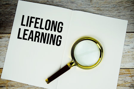 Lifelong Learning text message written on paper note with magnifying glass top view on wooden background
