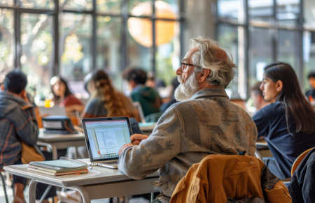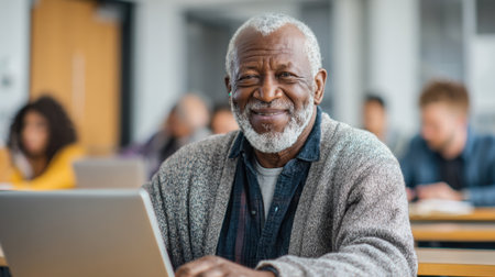 Senior man with white hair and beard using a laptop in a classroom setting, surrounded by other students.