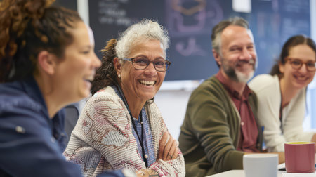 A diverse group of professionals engaged in a collaborative meeting at a modern workspace, smiling and sharing ideas during the afternoon