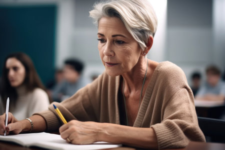 shot of an attractive mature female student writing notes on a piece of paper during class, created with generative ai