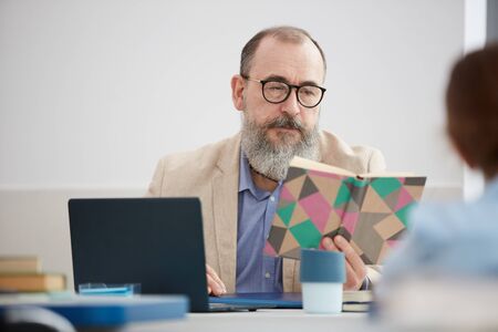 Portrait of mature bearded teacher reading book while sitting at desk in school classroom, copy space