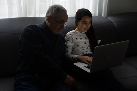 Adorable little girl and happy grandfather using laptop at home