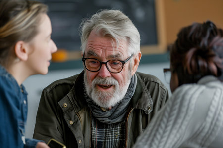 Elderly professor teacher man answer and explain during lesson with young students group in classroom. Generative AI