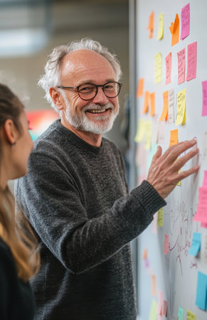 Senior man presenting ideas at a whiteboard, discussing strategies with female colleagues, post-its visible