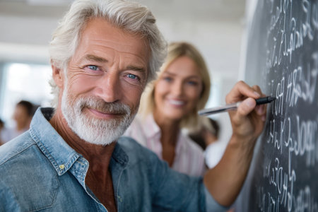 A senior educator writes notes on a chalkboard while a female colleague smiles in a bright classroom.