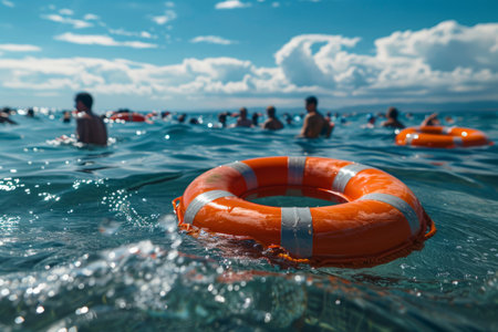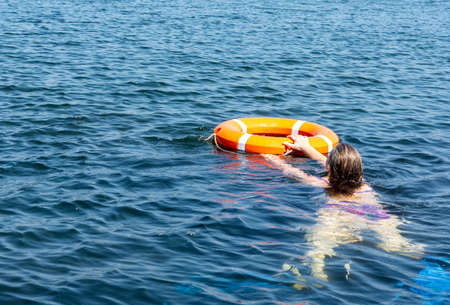 A person in open water extends a hand near a life ring, suggesting distress. The image displays a bright, daytime scene with blue tones dominating the composition. The life ring offers a visual focal point. Its potential uses span across various commercial and editorial contexts related to safety and assistance.