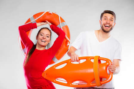 Accident prevention and water rescue. Young man and woman lifeguard couple on duty holding ring buoy float lifesaver equipment having fun on gray