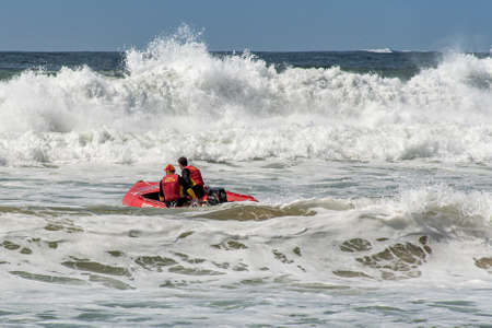 Cronulla, Australia 2020-02-15 Surf rescue life savers boat jumping on the waves at Wanda Beach, NSW, Australia.