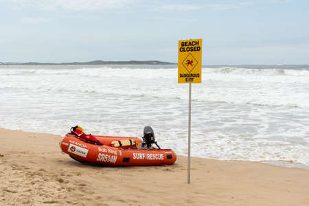 Cronulla, Australia 2020-02-15 Beach closed sign and surf rescue boat at the beach in Sydney. Despite the warning people are still swimming and surfing