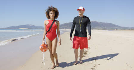 San Pedro de la Ribera, Spain - August 16, 2020: A couple of lifeguards from the public security services walk with the protective face mask on a beach in Asturias, in the middle of summer.