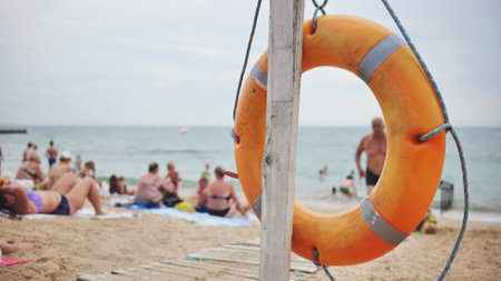 Orange lifebuoy resting on sandy crimean beach, sunbathing individuals surrounding lifesaving ring near black sea shoreline