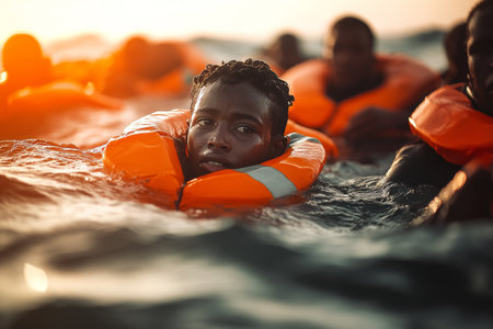 Stranded african refugees in life jackets struggle to stay afloat amidst the vast ocean s depths