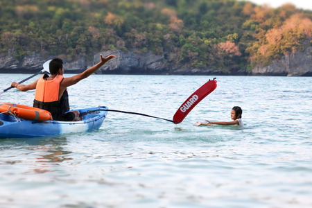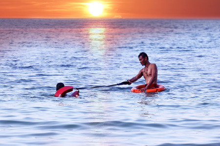A person in the water gets a lifeline to help. The concept of saving drowningr, motion blur .