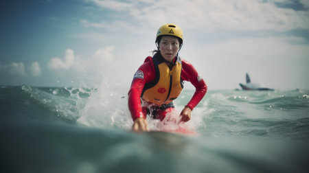 At the beach, a diligent lifeguard executes a water rescue drill, honing skills to ensure safety for swimmers and beachgoers.AI Generated