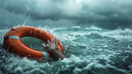 A single hand emerges from tumultuous ocean waves, grasping desperately at a bright life ring, portraying a vivid scene of struggle and hope for rescue in water.