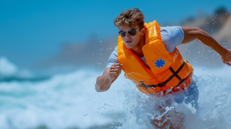Lifeguard runs into waves with flotation device towards swimmer in need. Bright sunny beach setting with ocean backdrop. Concept of beach safety, water sports, lifeguarding.