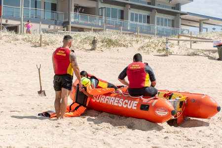 Cronulla, Australia 2020-02-15 Surf rescue life savers training in progress. Mannequin rescue pick up at Wanda Beach, NSW, Australia.