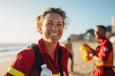 A very strong lifeguard scanning the seascape, watching over the beach on a nice hot day, providing security along the coastline in the summertime. Generative AI