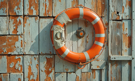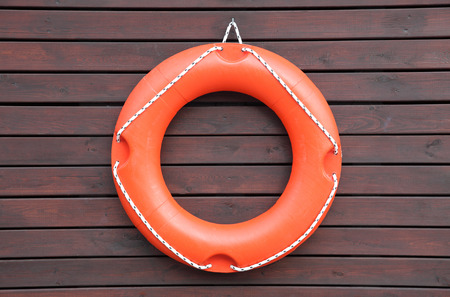 Orange lifebuoy hanging on green wooden board. Rescue equipment