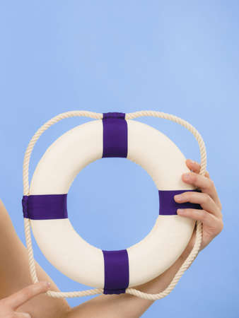 Close up of woman hands holding lifebelt in sea. Emergency drowning help concept