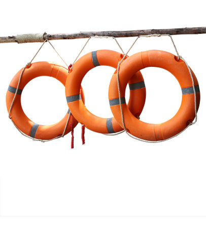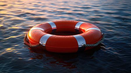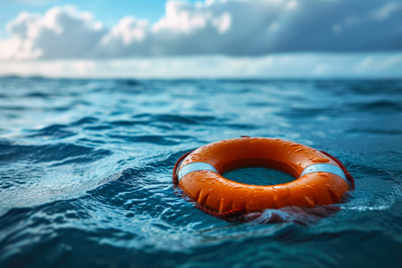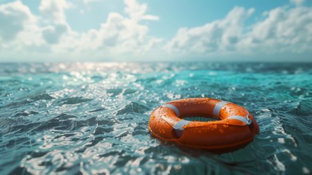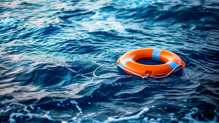 Orange lifebuoy in water. Life saving and help concept. Risks and safety in the water during summer season.