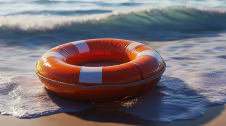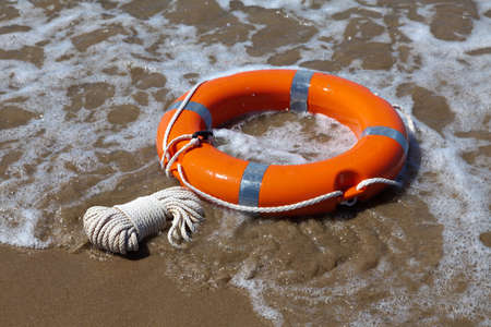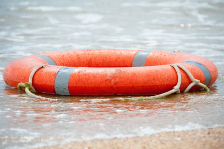 Red lifebuoy lies on the sand on the beach in foamy waves