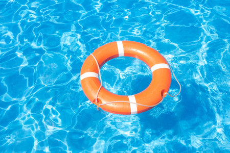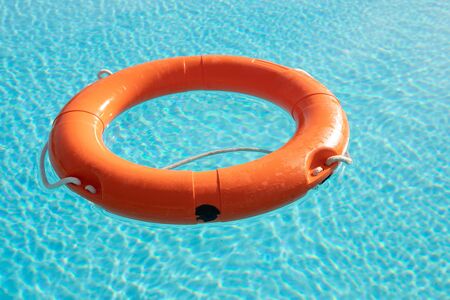 Lifebelt on sea or pool. Orange inflatable ring floating in blue water. Life buoy for protect and safety drowning.