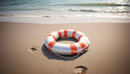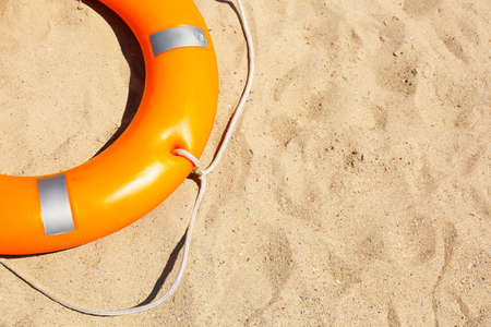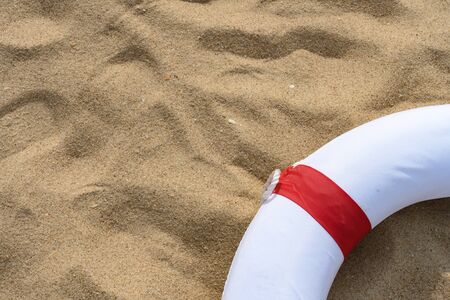 lifebouy on white sand. Copyspace for text. Concept of summer