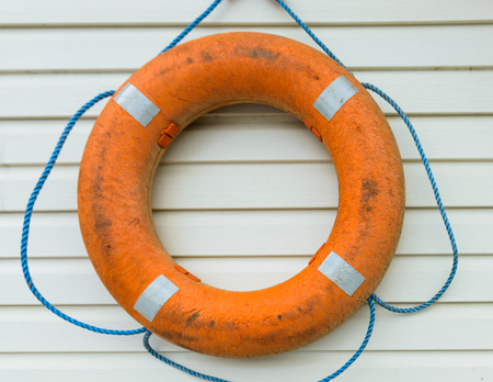 Orange lifebuoy hanging on a blue metal wall. Close up.