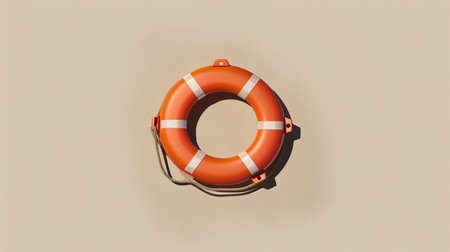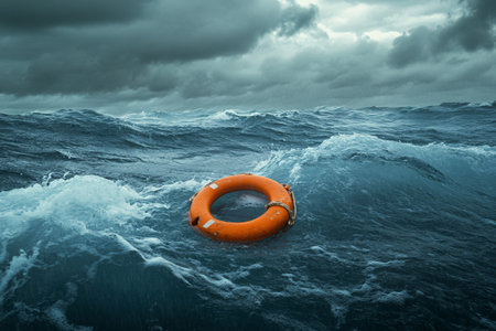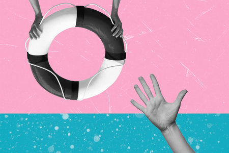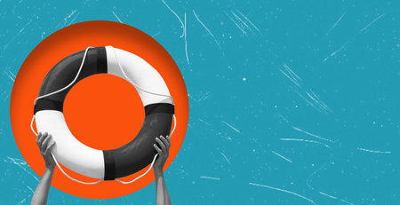 A person extends a hand toward a lifebuoy in a vibrant setting, symbolizing rescue and safety. The contrasting colors create a sense of urgency and hope in the scene.