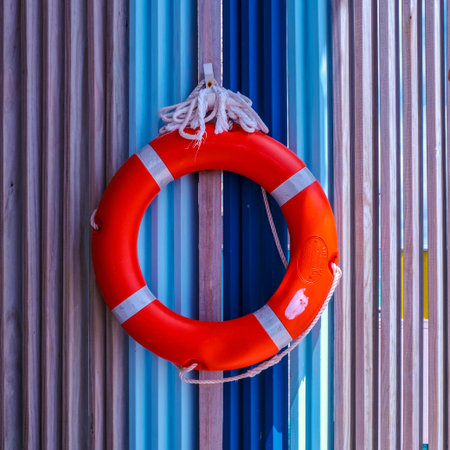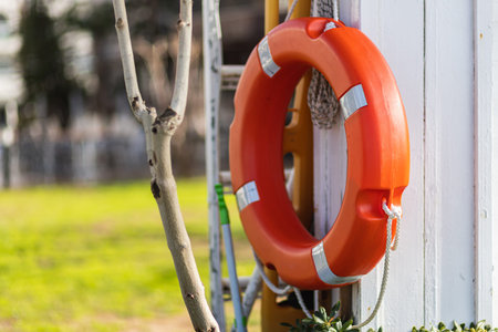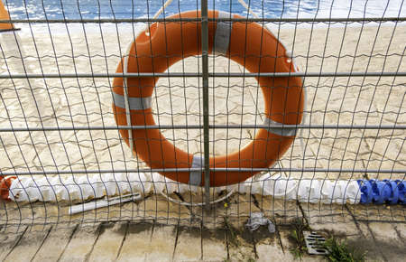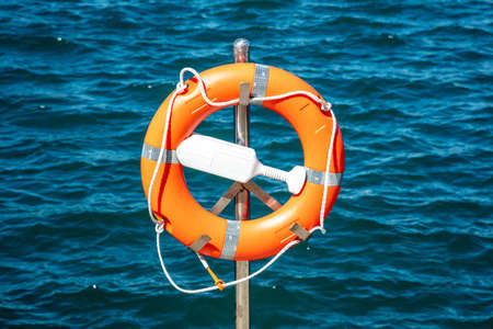 close-up lifebuoy on a field. Red lifebuoy on ship railing with sea surface
