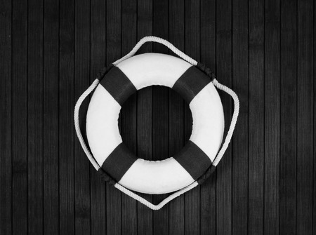 Orange rescue lifebuoy on dark gray background. Minimal travel by sea background