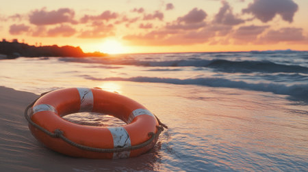 A brightly colored lifebuoy lies on the sandy beach, its paint worn from time. Soft sunlight bathes the scene in a warm glow, creating a serene atmosphere at dusk.