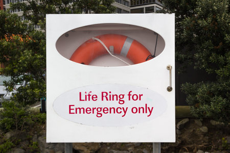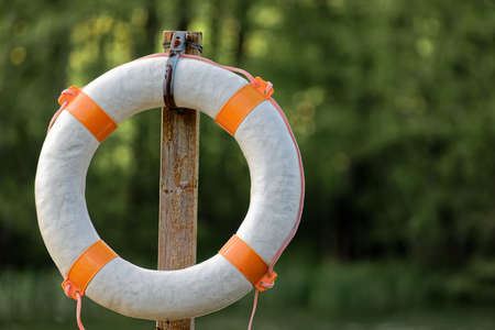 white orange life ring in front of green forest, strong focus on the ring with blurred background, for drowning swimmers life important, daytime, without people