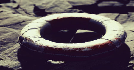 A weathered lifebuoy sits atop a rocky shoreline, bathed in soft sunlight. This serene environment suggests calm waters nearby, inviting contemplation.