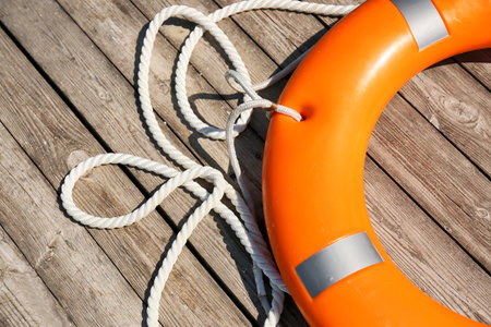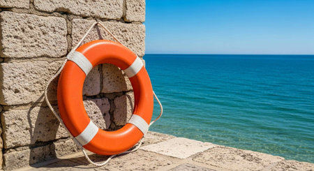 Lifebuoy on blue sky background. Life rescue equipment. Safety during water trip and urgent help concept. High quality photo