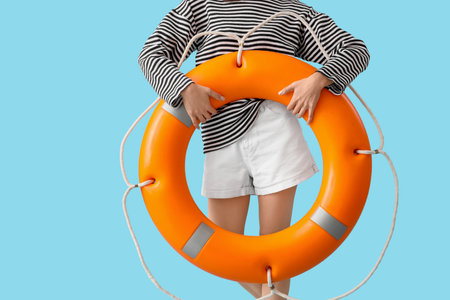 Hand showing white blue life buoy ring lifebelt with rope. Safety equipment. Accident prevention and water rescue.