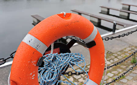 Orange lifebuoy in water. Life saving and help concept. Risks and safety in the water during summer season.