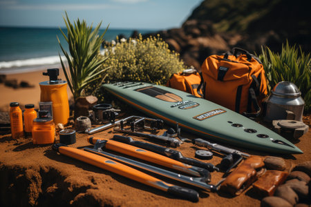 An AI generated illustration of a bag with a selection of tools on a dark background