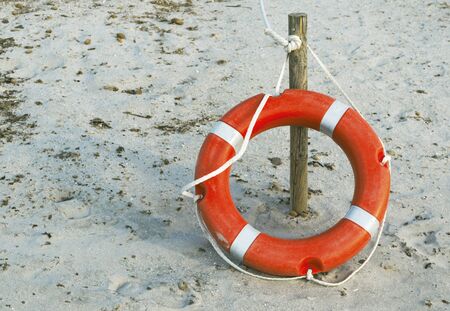 lifebouy on white sand. Copyspace for text. Concept of summer