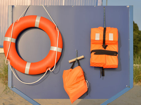 Close-up of an orange life jacket and lifebuoy on a wooden surface, highlighting their importance in emergency situations and water safety.