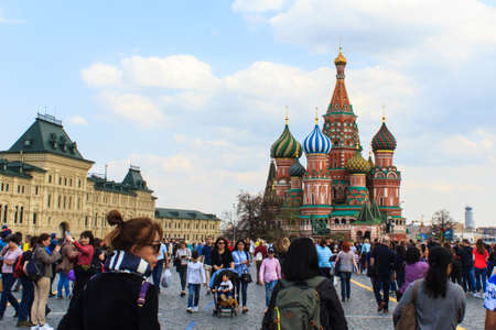 Moscow, Russian - April 30, 2018: Tourists visit Saint Basil's Cathedral in Red Square at Moscow, Russia.